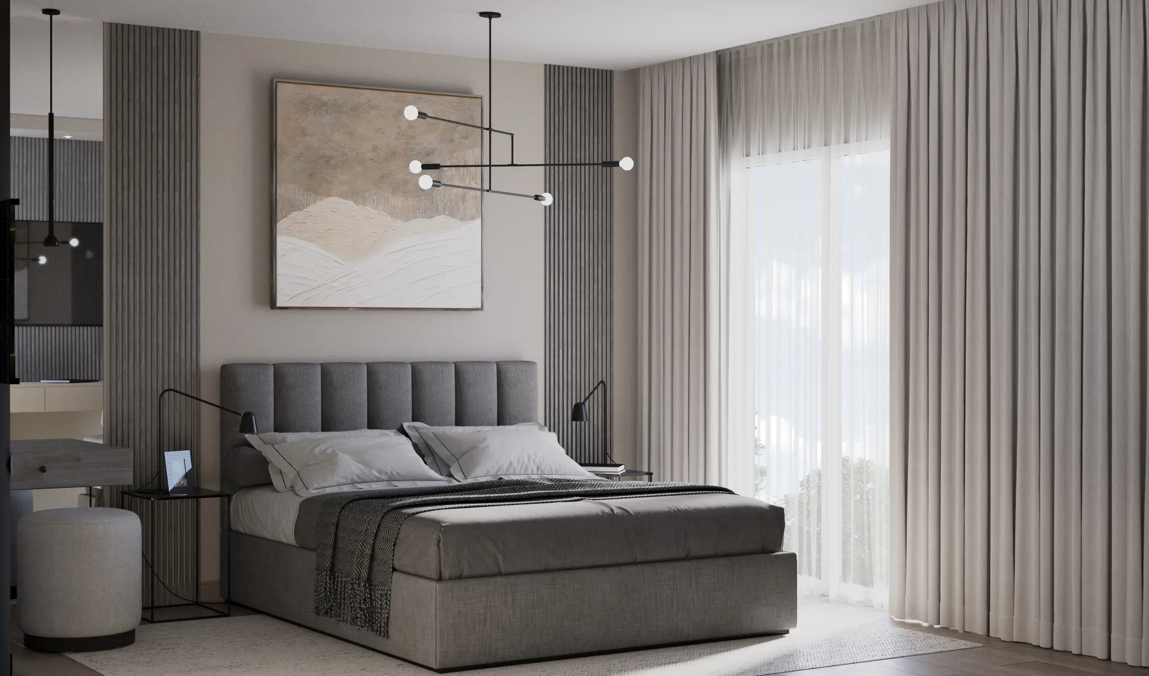 Modern bedroom visualization with soft neutral tones, built-in storage, a vanity table, and a compact layout designed for comfort and functionality.