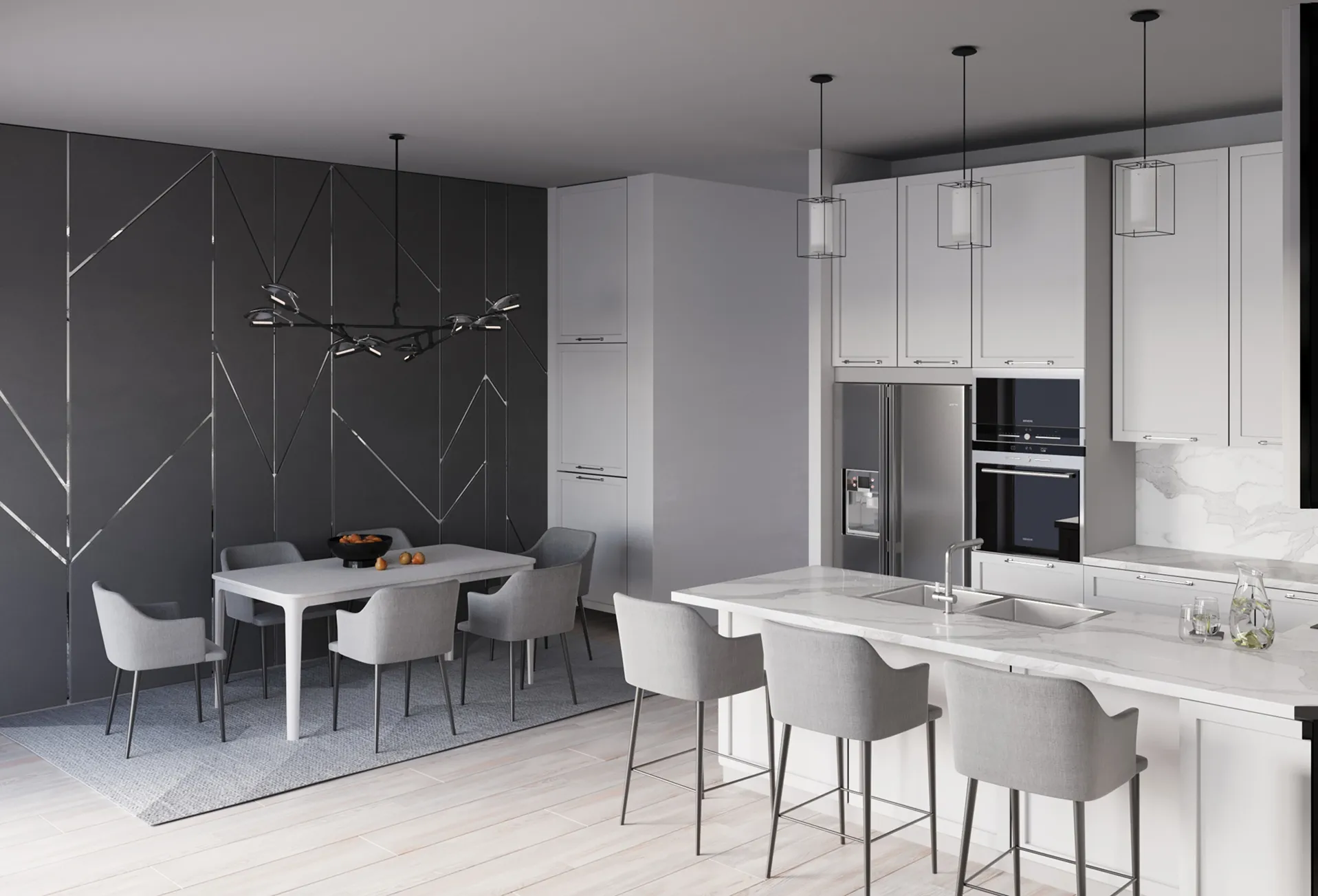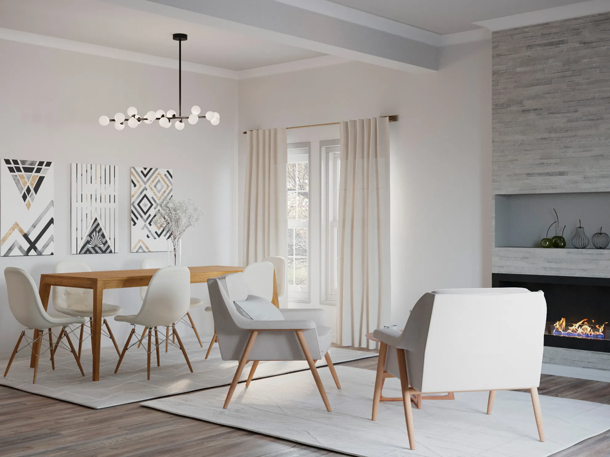 Photorealistic 3D interior rendering of a luxury living and dining space inspired by contemporary American interior design. This architectural visualization highlights refined materials, elegant lighting, and modern residential interior concepts.