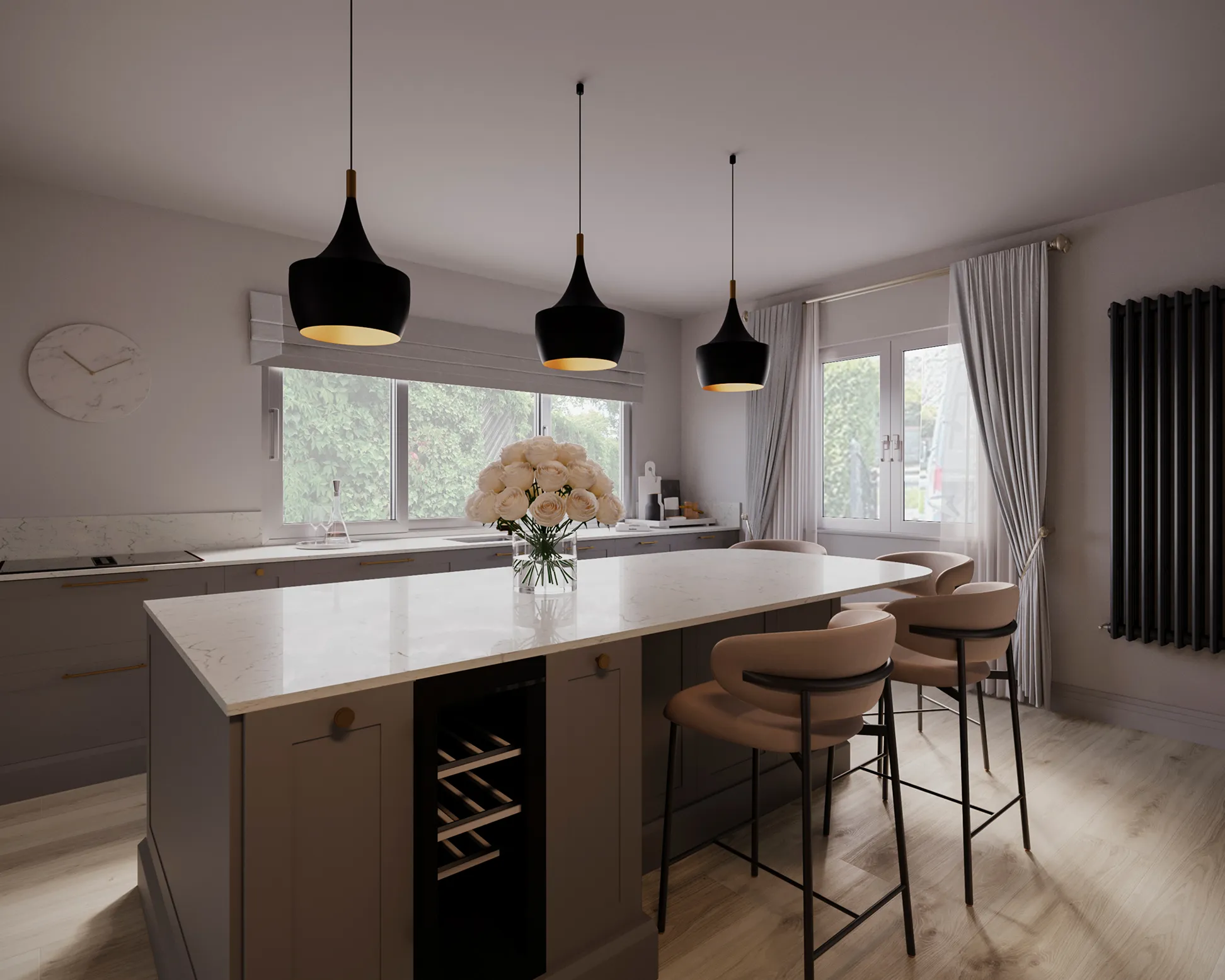 Photorealistic 3D kitchen interior visualization of a contemporary Irish kitchen featuring neutral cabinetry, marble surfaces, brass accents, and soft natural lighting.