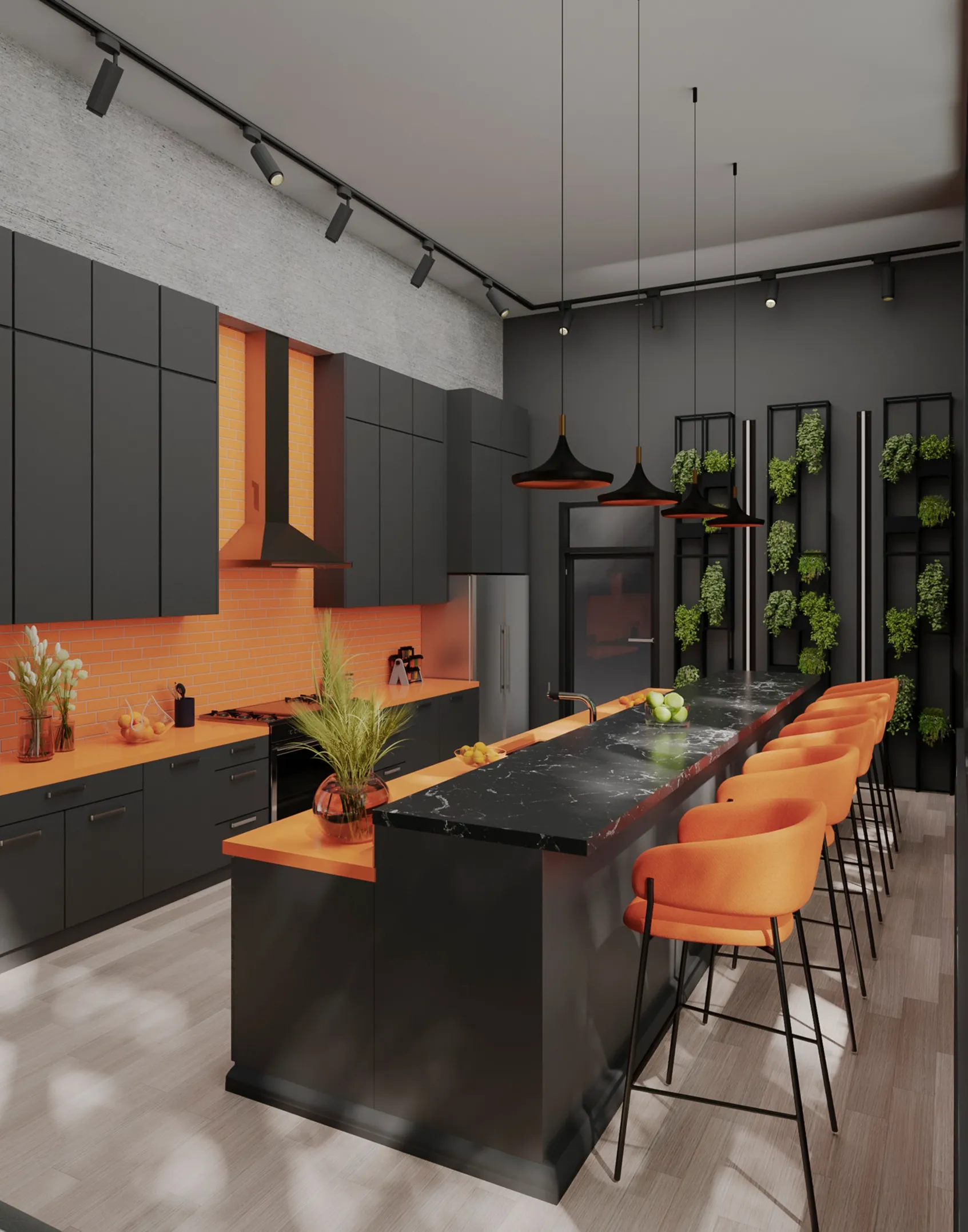 Modern kitchen interior visualization showcasing dramatic color contrast, dark cabinetry, vibrant orange surfaces, and natural light in a photorealistic 3D render.
