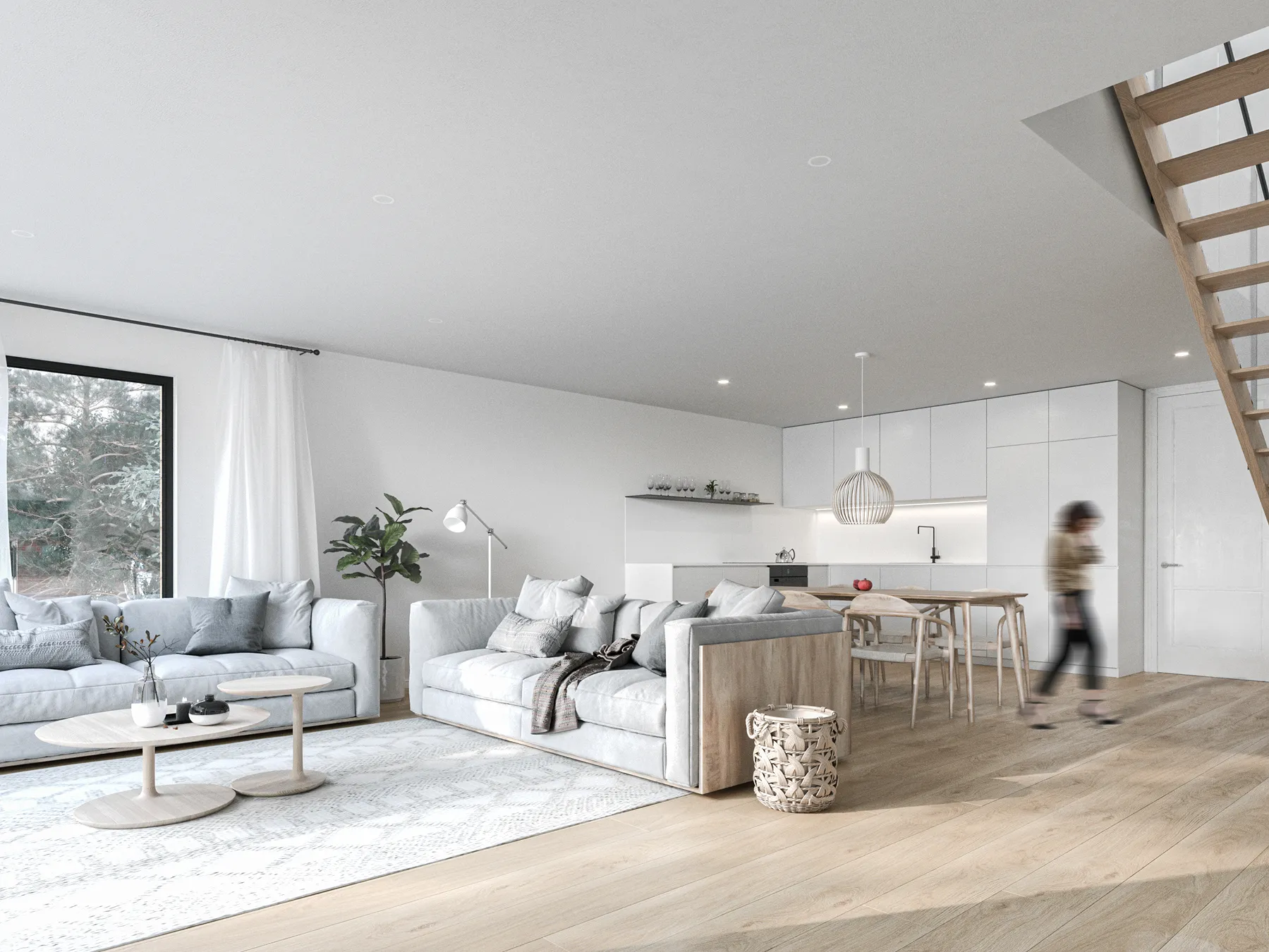 Scandinavian interior visualization featuring a calm open-plan living space, natural wood textures, soft neutral tones, and modern minimalist design.