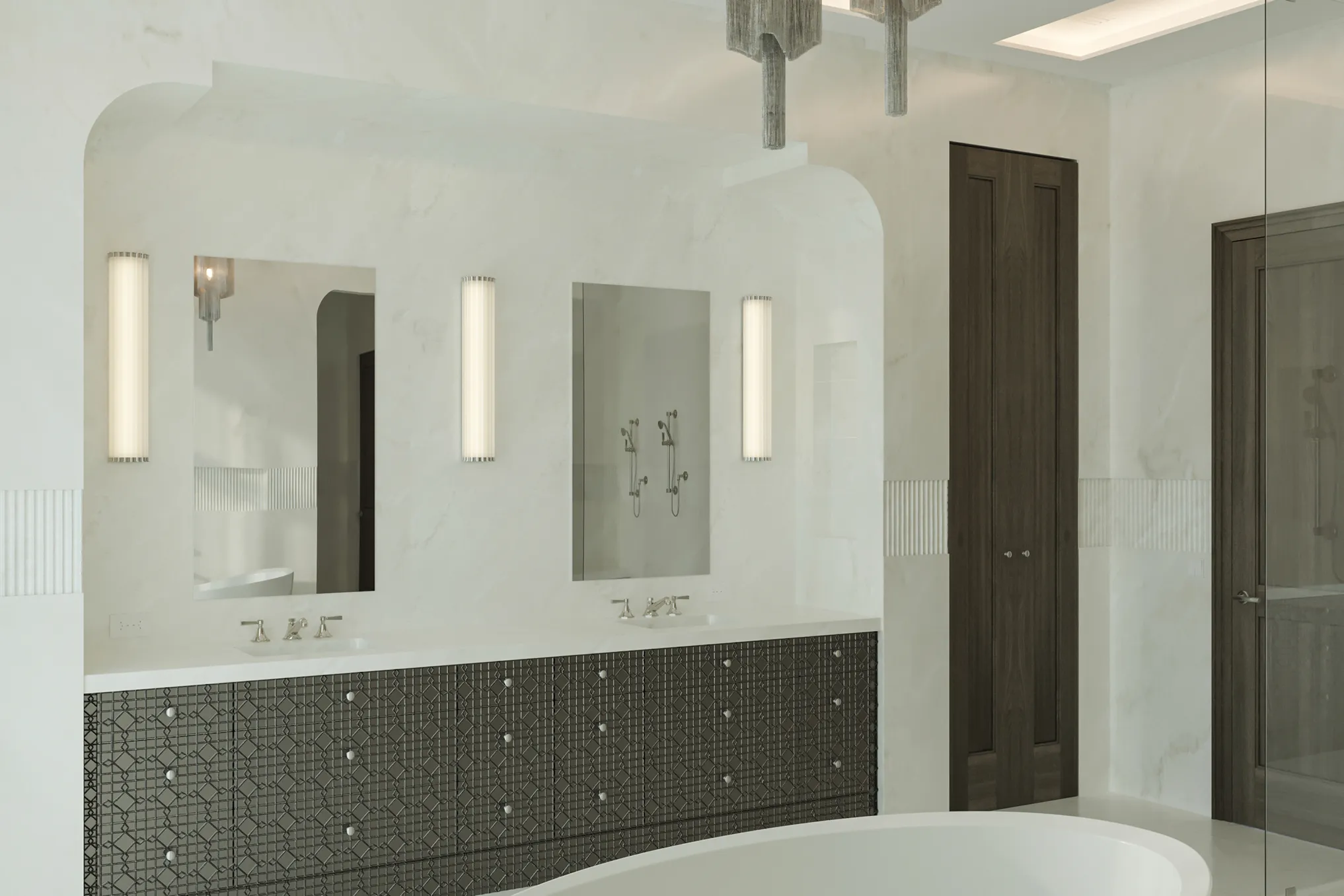 A refined residential bathroom visualization designed to highlight a calm spa-like atmosphere, elegant materials, and contemporary architectural details.