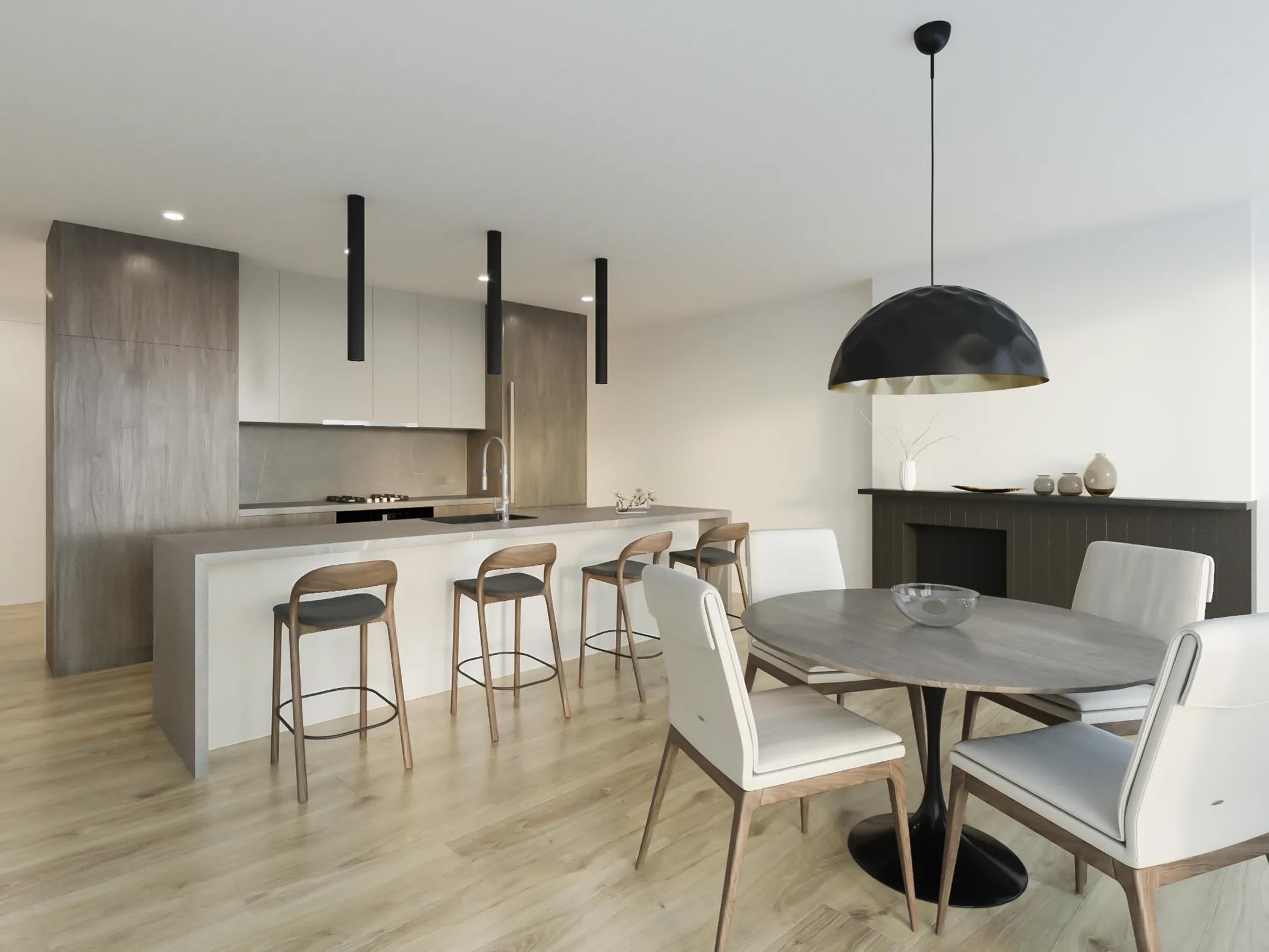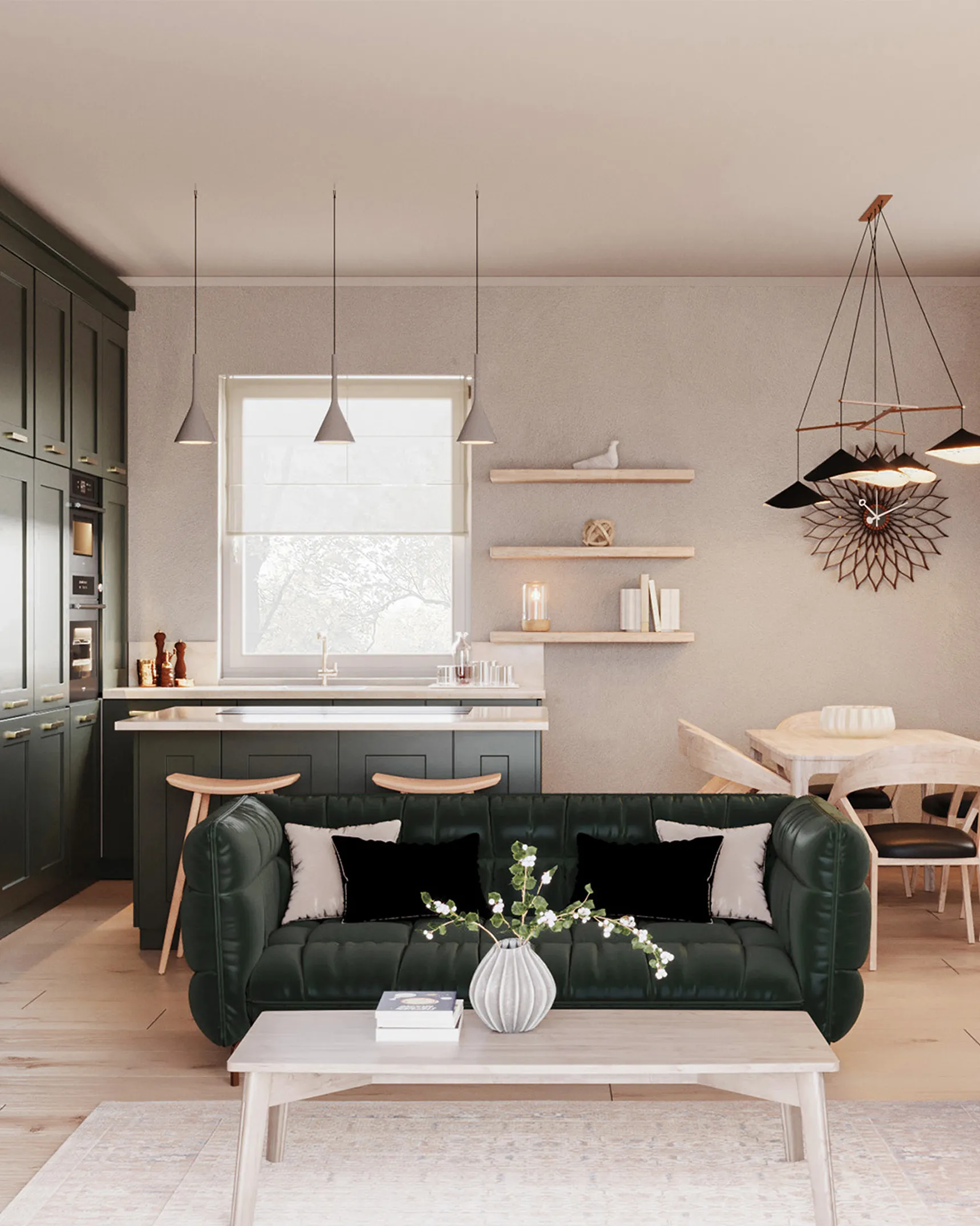Photorealistic 3D interior visualization of a Scandinavian residential living and kitchen space featuring Nordic minimalism, natural materials, soft lighting, and clean architectural geometry.